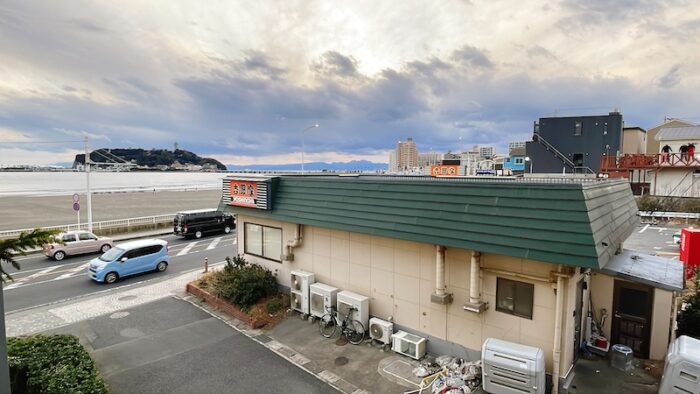 ベランダに出て見える景色はこのような感じ。お隣のお店がメインビューみたいになっていますが、江ノ島や海を見ることができます。