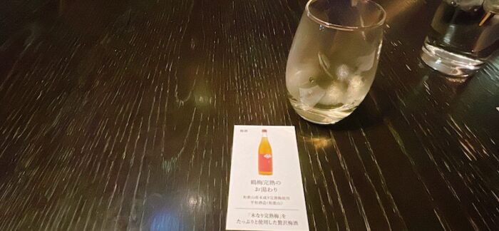 早速、食前酒をいただきました。木なり完熟梅を使った梅酒のお湯わり。