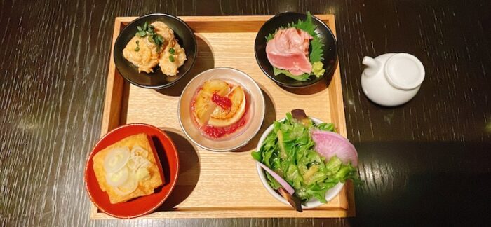 前菜豆皿5種がやってきました。豆皿と言っても、なかなかのボリュームです。