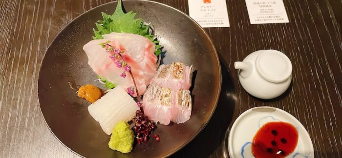 続いてはお造りで地魚二種類、そしてイカ刺し わた添えです。